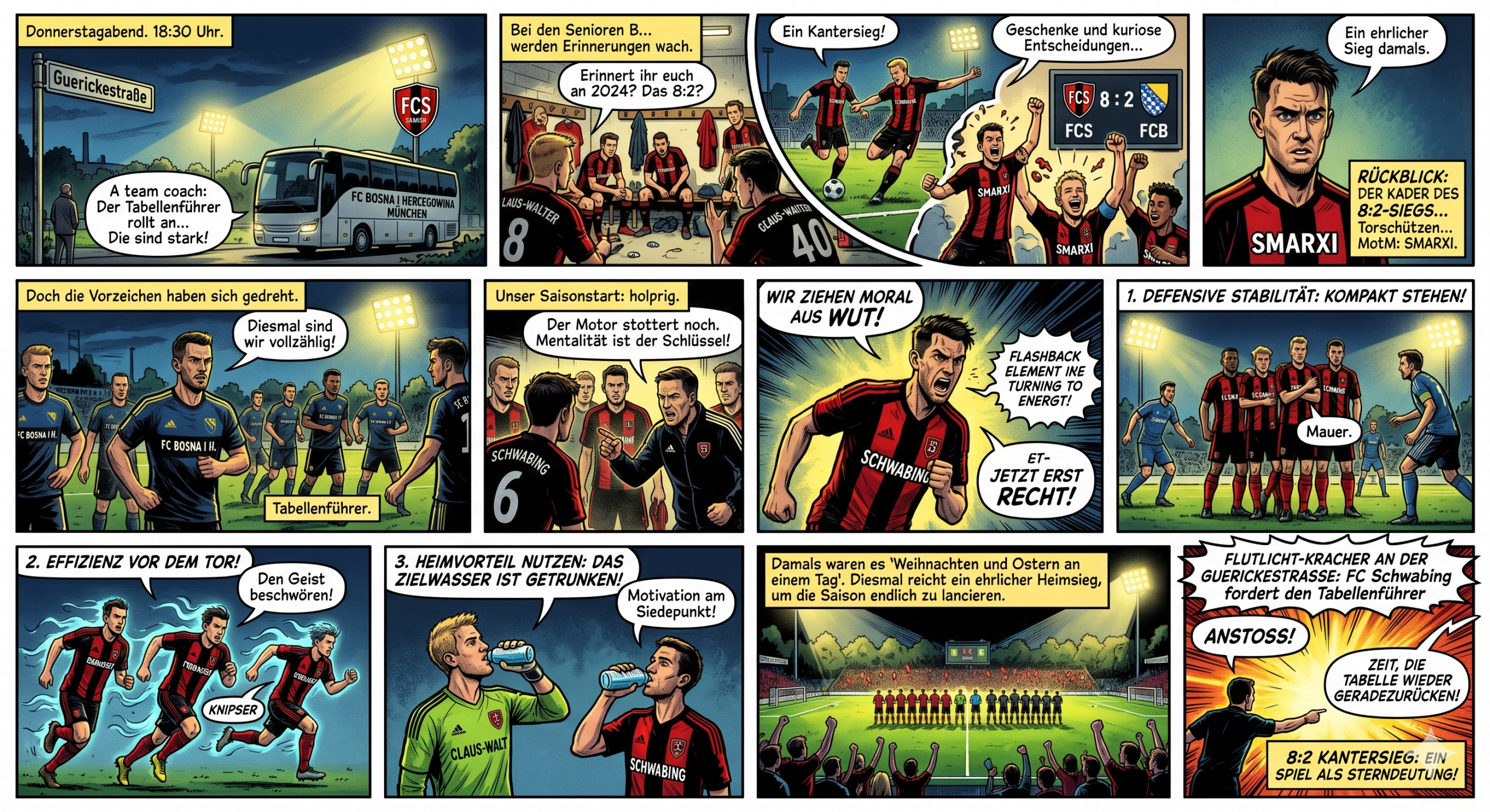 Wenn am Donnerstagabend der FC Bosna i Herzegowina München zum Kreisliga-Duell vorfährt, werden bei den Senioren B des FC Schwabing unweigerlich Erinnerungen wach. Das letzte Aufeinandertreffen im Jahr 2024 glich einer vorgezogenen Bescherung: Mit einem fulminanten 8:2-Kantersieg schickte man den langjährigen Rivalen nach Hause – ein Spiel, das trotz kurioser Schiedsrichterentscheidungen und „Geschenken“ als Sternstunde in die Chronik einging.